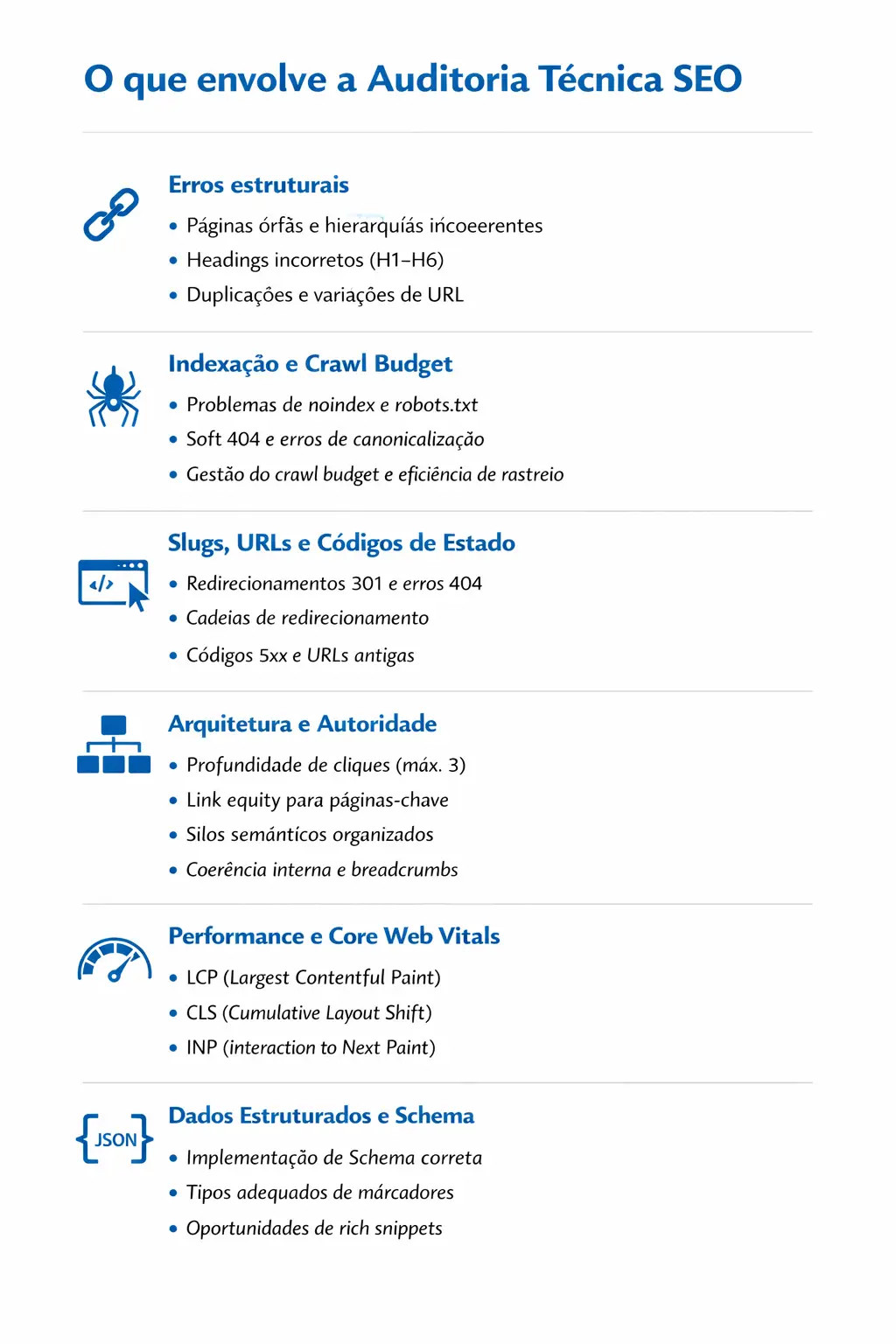 Este serviço faz sentido quando há estagnação prolongada nos rankings, quedas após atualizações do Google, dificuldades de indexação, crescimento orgânico inconsistente ou discrepâncias entre páginas publicadas e páginas efetivamente visíveis na pesquisa. Também é indicada antes de qualquer trabalho sério de otimização on-page ou criação de conteúdos, para garantir que a base técnica não limita os resultados.