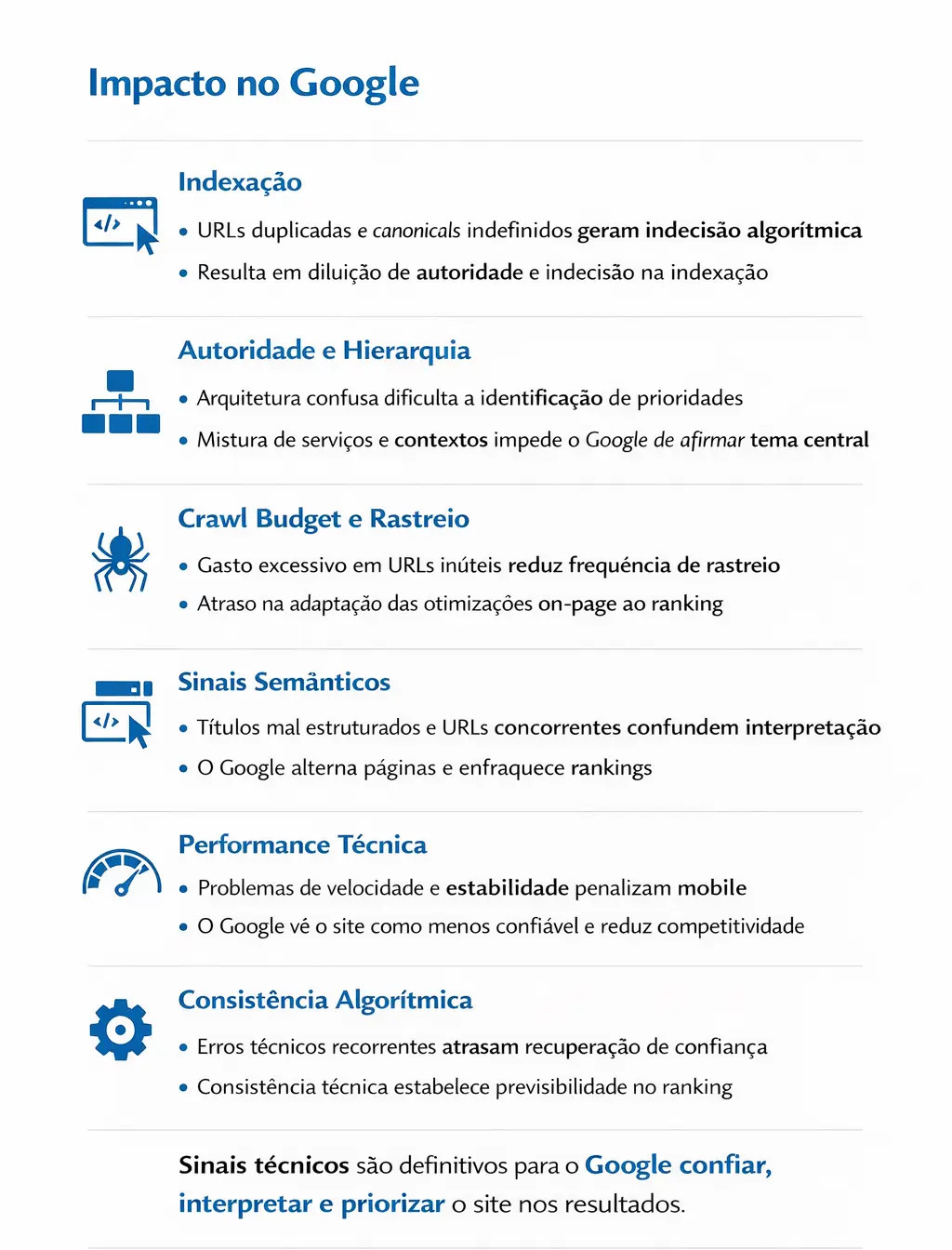 O primeiro impacto direto ocorre ao nível da indexação. Sempre que o Google encontra URLs duplicadas, canonicals incoerentes, parâmetros desnecessários ou páginas bloqueadas sem intenção estratégica, surge indecisão algorítmica. O motor deixa de ter certeza sobre qual versão deve indexar e qual deve ignorar. Essa indecisão traduz-se em diluição de autoridade, menor frequência de rastreio das páginas-chave e dificuldade em consolidar relevância numa única URL.