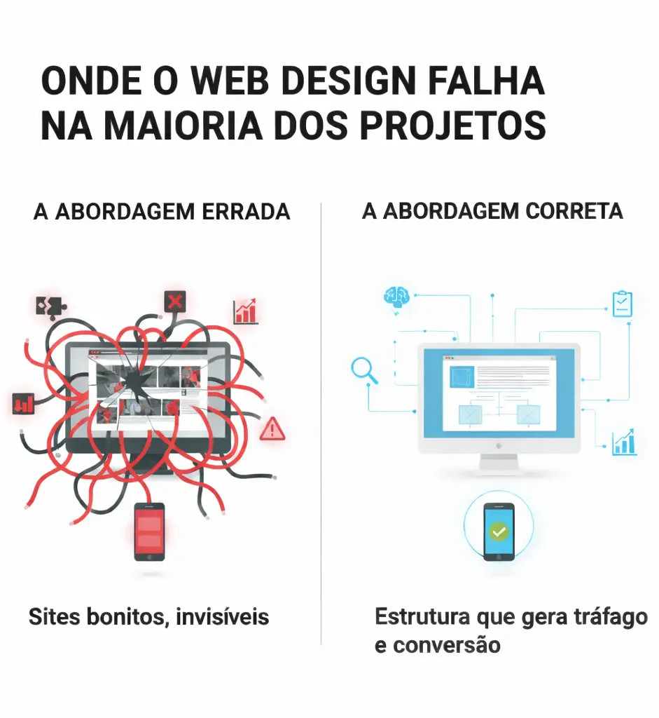 No web design, a diferença entre um site que funciona e um site que falha está nas decisões tomadas antes da execução. Escolhas visuais feitas sem critério estrutural tendem a gerar ruído, dificultar a navegação e limitar o crescimento orgânico. É por isso que o web design deve ser encarado como uma decisão estratégica, não apenas criativa.