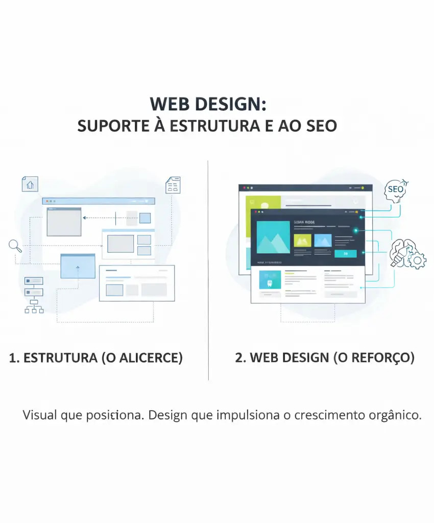 Web Design orientado a estrutura e performance O web design não deve ser encarado apenas como estética ou identidade visual. Um projeto visual de excelência é aquele que reforça a estrutura do site, facilita a leitura do conteúdo e ajuda o utilizador a navegar com clareza. Quando o layout é pensado sem estratégia, o resultado costuma ser previsível: páginas apelativas, mas confusas para o Google e pouco eficazes na conversão.